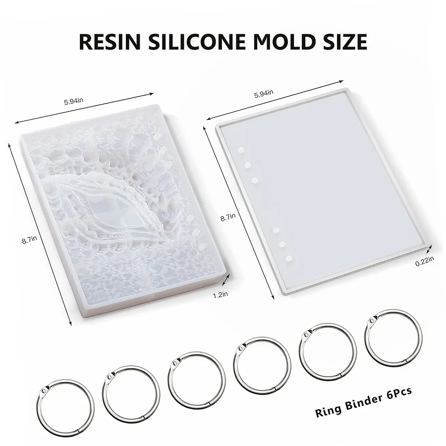 What You Will Get: 1pc unique dragon eye pattern notebook front cover silicone mold, 1pc plain notebook back cover silicone mold, 6pcs metal book ring binder.1 pc notebook book core. Unique dragon eye pattern notebook front cover silicone mold size: 8.7″L x 5.94″W x 1.2″H. Plain notebook back cover silicone mold size: 8.7″L x 5.94″W x 0.22″H.