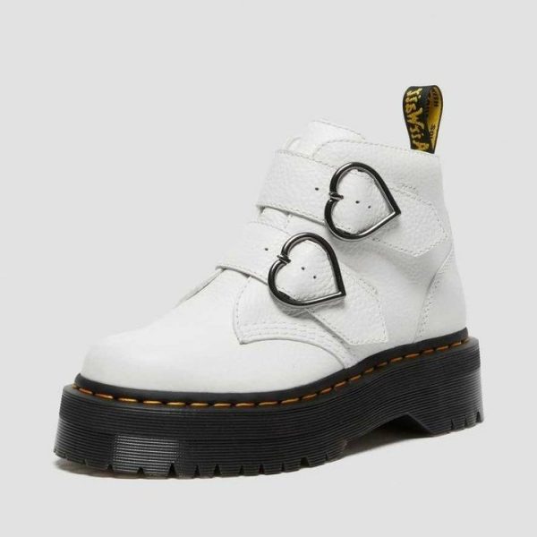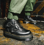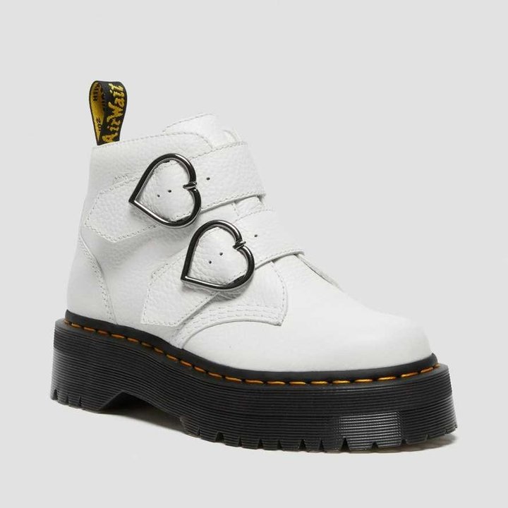 It’s back. And it’s louder than ever. Sitting on a towering 1 7/8 inch platform sole, our new Devon Heart boot nods to our history of customization with DIY-inspired detailing. Decked out with two straps woven and standout heart-shaped buckles, the boot is built from fine-grained Milled Nappa — a hardwearing pebbled leather. Fitted with a padded tongue and quarters for additional comfort, the platform boots are finished with yellow welt stitching and a black and yellow heel loop.