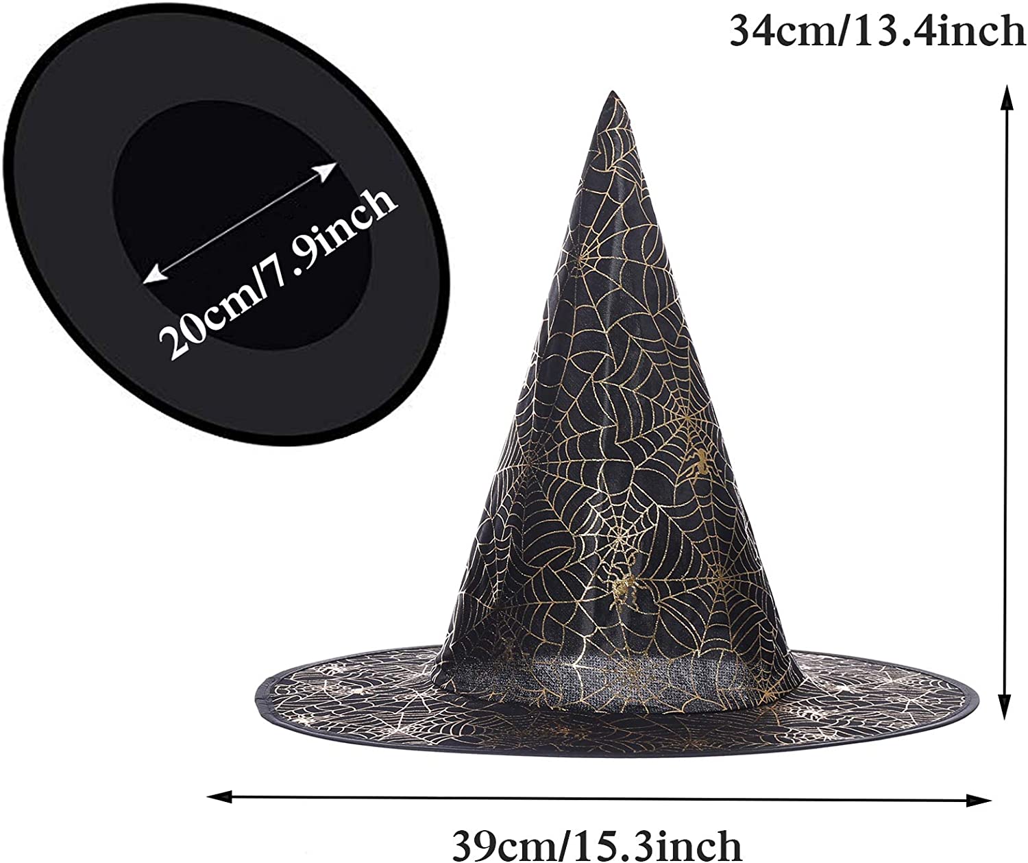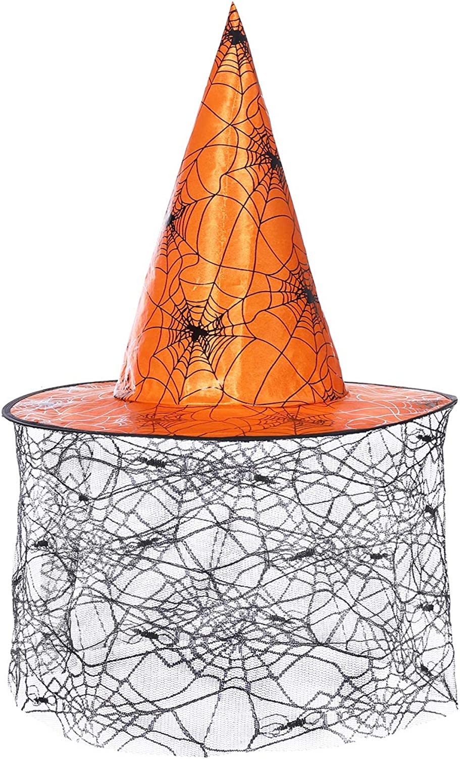 - ★Size & Color: One size. Length: 39cm/15.35”, inner diameter: 20cm/7.87”, height: 34cm/13.39”, lace curtain: 25cm/9.84”. Please check the Size Chart in the pictures or below in the product description carefully before order. And 5 styles and 12 colors available – black+silver/black+gold cobweb, wine red/purple/orange lace, orange/black sequins, purple/blue/gold transparent spider, orange/purple veils. This retro witches hat will be a good halloween party supplies, bring a happy atmosphere.